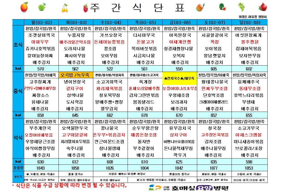 제목 3월 첫째주 식단표