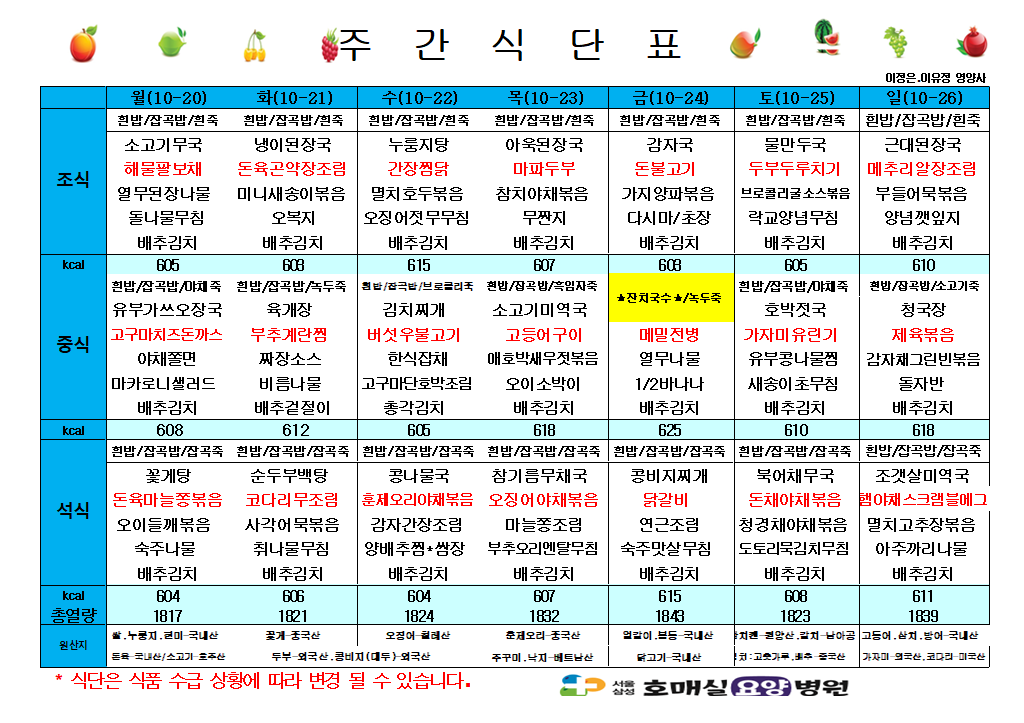 제목 10월 셋째주 식단