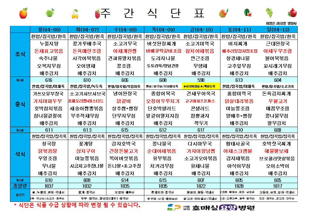 제목 4월 둘째주 식단표